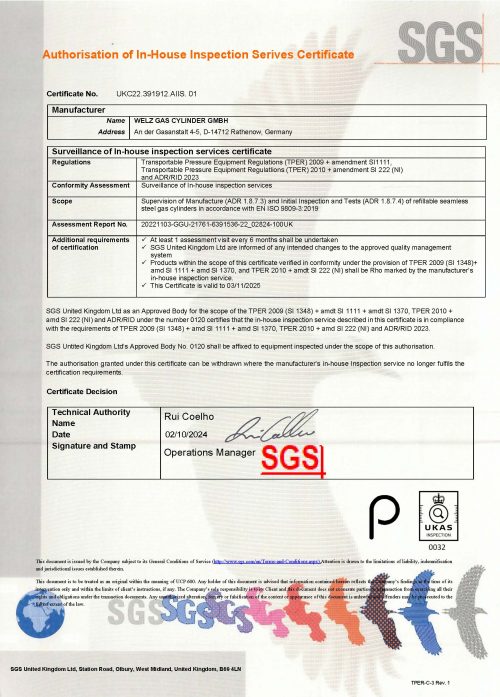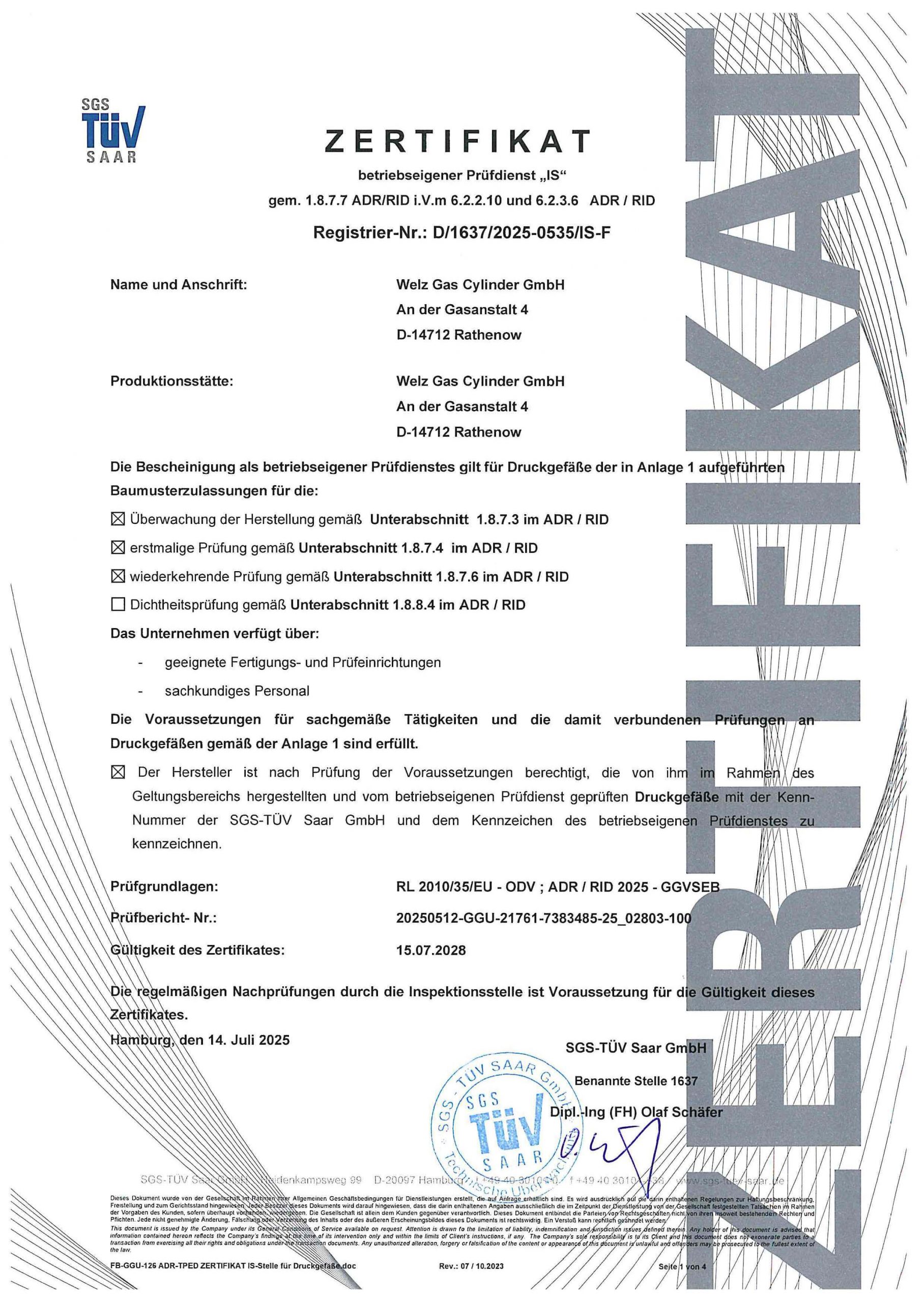 The Welz Gas Cylinder GmbH is registered as “Inhous inspection service” according to EU Directive 2010/35 and ADR.